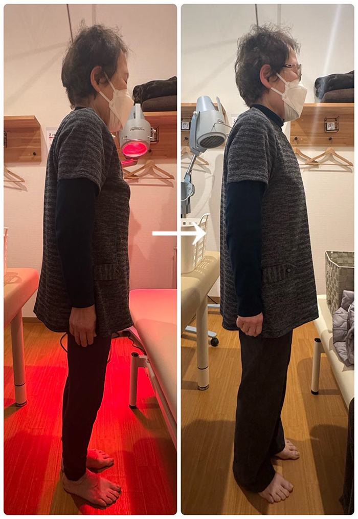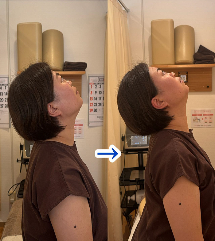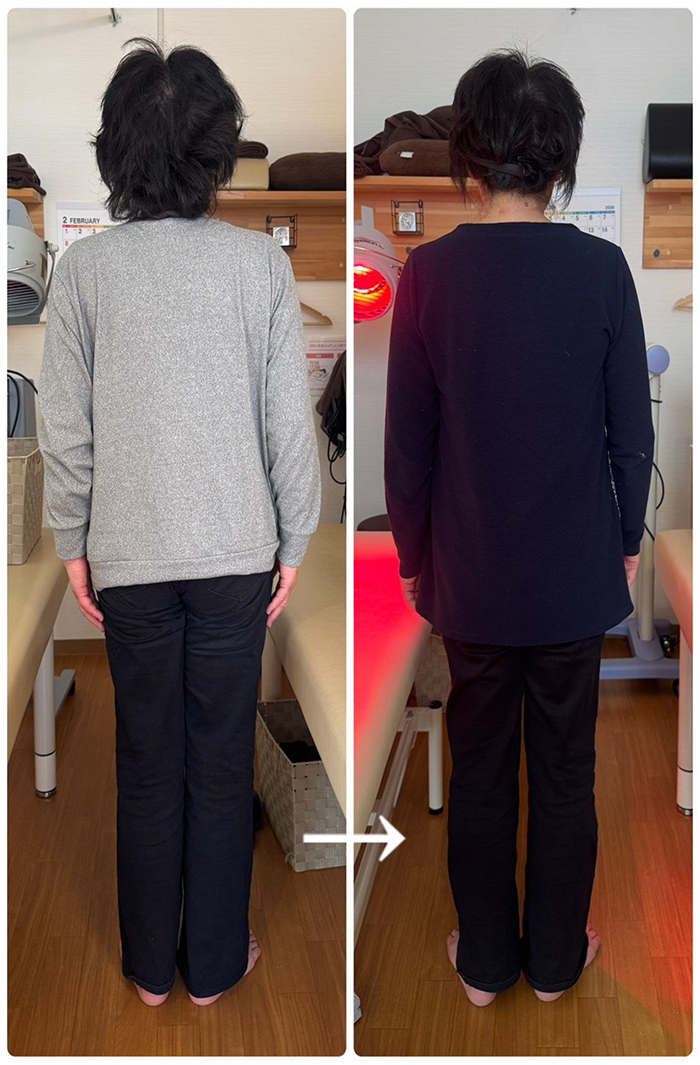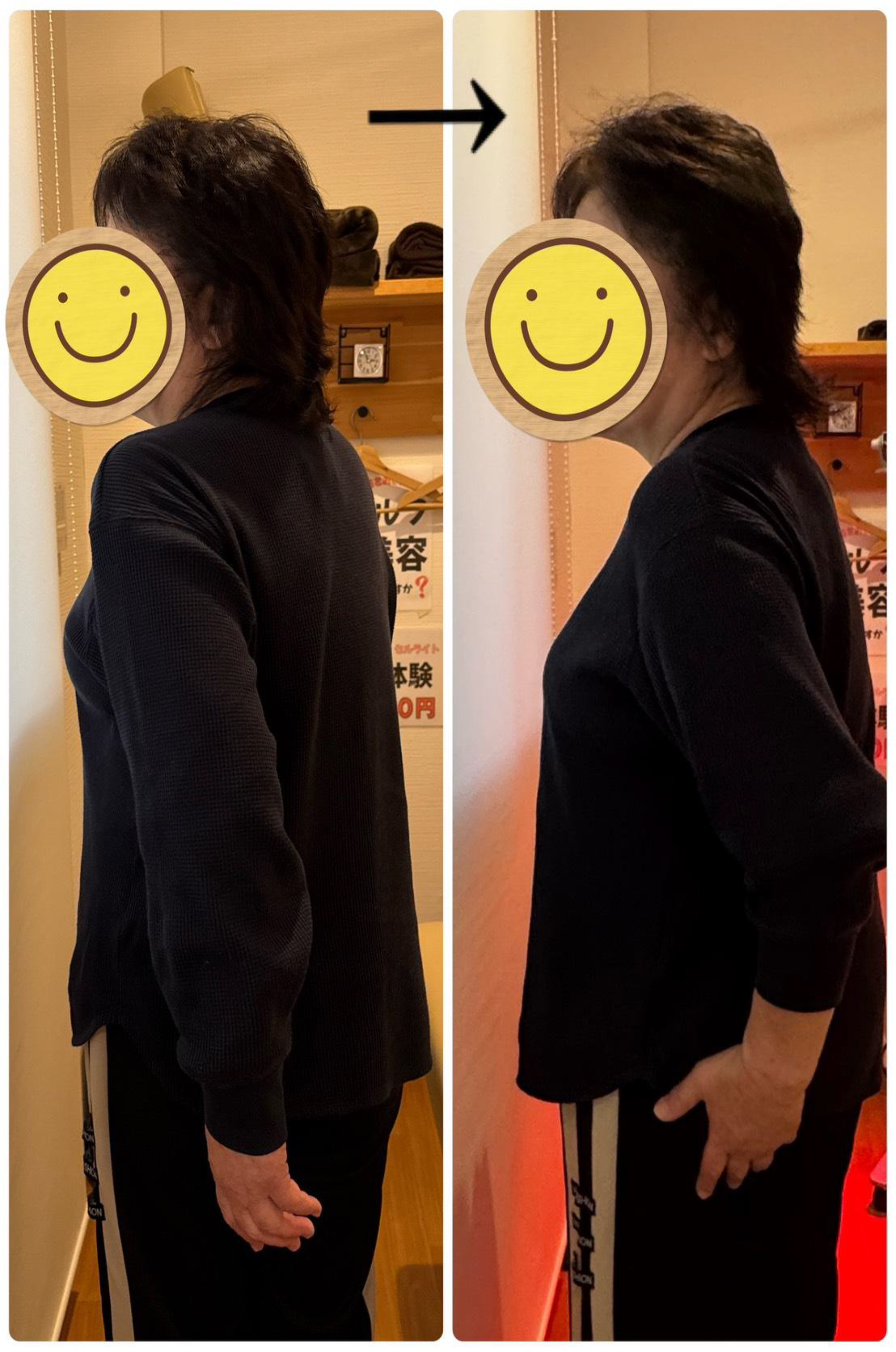 後面全体的に苦しいのと鈍痛があり、このまま放置するとぎっくり腰を再発するのではと感じ、たまたまチラシが入っていたので、一度受けてみようと思い来院しました。あと、前から気になっていたスマホ首や巻き肩、姿勢も悩んでおりました。