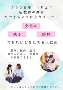 女性の親子・姉妹であれば一つの回数券をご家族で共有してご利用いただけます。